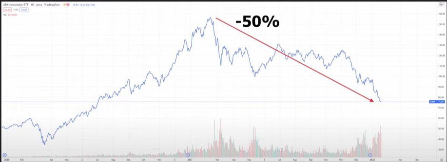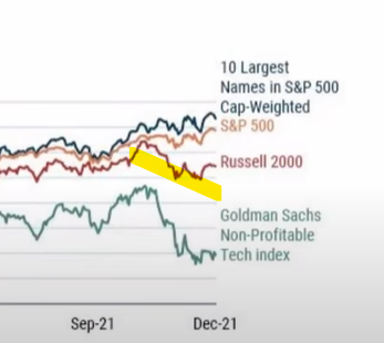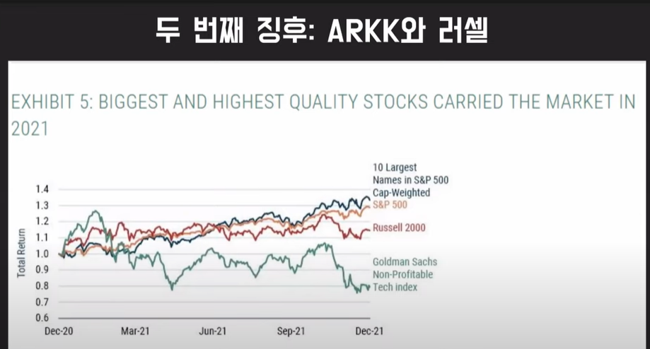 제레미 선생님의 말로 버블은 초기에는 소형주과 이익을 못내는 기업이 우량주들보다 더 높게 뛰다가 그 추세가 바뀌면서 (우량주의 주가가 더 상승한다) 터지는 경향이 있다고 합니다. 소형주 위주의 Russell 2000 지수가 2021년에는 S&P500보다 흐름이 좋다가 2021년 10월부터 추세가 꺾이는 형태를 보이고 있습니다.