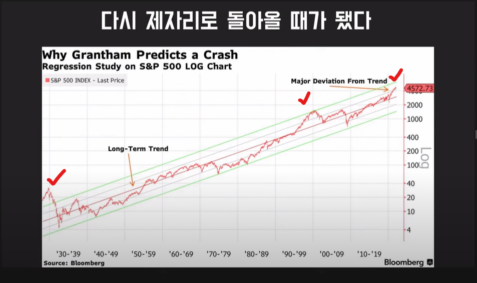 김단테 선생님 曰 : 이는 로그 그래프이기 때문에 평균값으로 회귀한다는 것은 50%이상 폭락해야 평균값으로 회귀할 수 있음을 의미합니다.. 회귀 차트를 보면 그런가보다 싶기도 한데, 30-39년을 보면 밴드 최상단을 넘어서고도 한참동안 올라간 적도 있던적도 있습니다. 지금이 더 갈수있는 구간이 아니라는 보장은 무엇입니까? 비싼것은 인정하지만 확실한 증거가 될 수 있나 의문입니다.